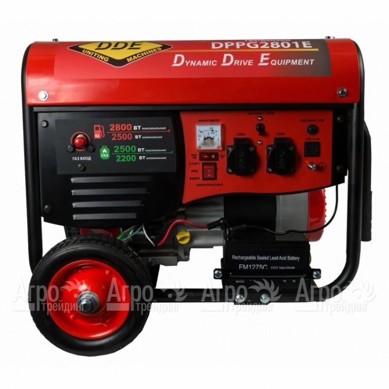 Характеристики товара: Бензогенератор DDE DPPG2801E 2.5 кВтПодробное описание товараБензогенератор DDE DPPG2801E обеспечивает выработку и подачу электроэнергии на жилые, хозяйственные, строительные объекты, либо в условиях, где нет централизованного энергоснабжения. Отличительная особенность бензогенератора DDE DPPG2801E заключается в возможности использования разного вида топлива, модель работает как на бензине, так и сжиженном газе. При использовании бензина суммарная мощность подключаемых потребителей не должна быть выше 2,5 кВт, при использовании газа, не более 2,2 кВт. Конструкция генератора выполнена в виде рамы на колесах, которая обеспечивает прочность и удобство перемещения. Рабочая панель оборудована розетками: 220В - 2 шт., 12В - 1шт., вольтметром, переключателем режимов, электростартером. Топливный бак имеет индикатор, который показывает когда необходимо пополнить топливо в баке.