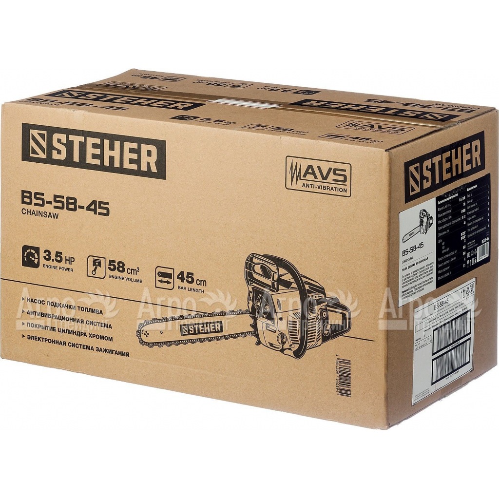 Характеристики товара: Бензопила Steher BS-58-45-18"Подробное описание товараБензопила Steher BS-58-45-18 – незаменимый инструмент для каждого дачника, садовода или владельца дома с печным отоплением. С ее помощью можно распиливать заготовки из древесины, заготавливать дрова и проводить садовые работы по обрезке деревьев. Также инструмент пригодится для пиления досок, брусьев, толстых стволов и т.д. Отличительной особенностью серии является антивибрационная рукоять, сокращающая нагрузку и негативное воздействие на человеческий организм. Несмотря на компактные габариты, агрегат имеет мощный двигатель внутреннего сгорания, который справляется даже с повышенными нагрузками. Вдобавок, серия укомплектована насосом для подкачки топлива, упрощающим запуск в холодную пору года. Наличие электронной системы зажигания способствует ровной, экономичной и экологичной работе силового агрегата, а принудительная подача смазывающей жидкости сокращает степень износа расходных материалов (цепи и шины). Также пила комплектуется тормозом мгновенного действия, обеспечивающим высочайший уровень безопасности при работе, а также останавливающим пильную цепь при возникновении опасности. Технология предварительной очистки воздуха очищает входящий поток от крупных части, продлевая срок службы фильтра. Из дополнительных плюсов устройства можно выделить эргономичную рукоять, и наличие емкости для смешивания топлива с маслом в комплекте.