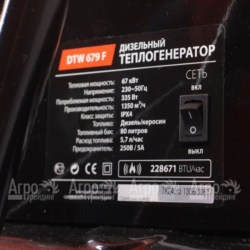Характеристики товара: Дизельная тепловая пушка Patriot DTW 679FПодробное описание товараДизельная тепловая пушка Patriot DTW 679F оборудована дымоходом для выхода продуктов сгорания и может применяться для обогрева производственных цехов, сельскохозяйственных ферм, складских помещений, сушки помещений строительных объектов при отделочных работах. Имеет систему автоматического охлаждения, камера сгорания из огнеупорной стали. Благодаря современным системам оснащения обогревательного устройства - контролю пламени, защите от перегрева, диагностике неисправностей обеспечивается безопасность эксплуатации. На панели имеется встроенный термостат с цифровым индикатором. При эксплуатации используется дизельное топливо. Наличие металлической опоры и колес обеспечивают устойчивость конструкции и удобную транспортировку тепловой дизельной пушки Patriot DTW 679F. |