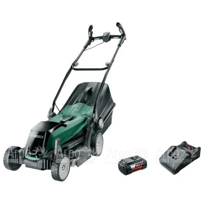 Характеристики товара: Газонокосилка аккумуляторная Bosch EasyRotak 36-550Подробное описание товараГазонокосилка аккумуляторная Bosch EasyRotak 36-550 предназначена для обслуживания участков небольшой и средней площади. Данная модель идеально подходит для использования в быту. С её помощью можно быстро привести в порядок придомовую территорию, садовые дорожки, детскую площадку. Косилка не относится к самоходной садовой технике, но работать с ней очень просто. Агрегат немного весит и легко катиться на широких колёсах, установленных на подшипниках. Эргономичная рукоятка сконструирована так, чтобы все элементы управления машиной всегда находились под рукой. При необходимости рукоятку можно отрегулировать под рост оператора, а в транспортном положении сложить пополам. Электродвигатель газонокосилки Bosch EasyRotak 36-550 запускается нажатием одной кнопки. В качестве источника питания силовой установки используется литий-ионный аккумулятор. Батарея характеризуется способностью быстро заряжаться, и длительное время обеспечивать электроэнергией потребителя. Роторный нож машины режет быстро и ровно. Скошенная трава собирается в пластиковый травосборник, который легко освободить от растительной срезки. Высота кошения регулируется центральным рычагом. Стоит отдельно отметить способность косилки выкашивать траву вдоль ограждений и по краям газона.
