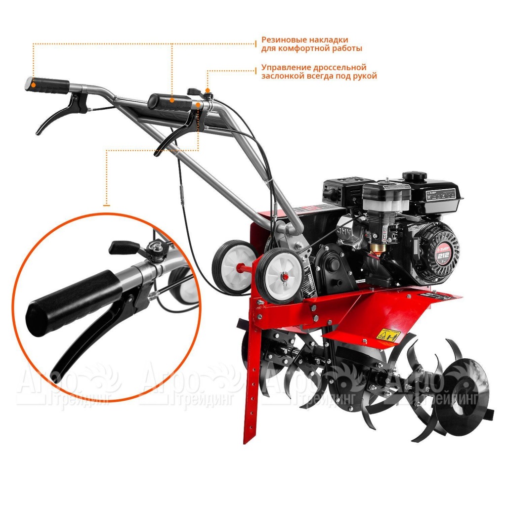 Характеристики товара: Культиватор Зубр МКТ-200Подробное описание товараКультиватор Зубр МКТ-200 – это сельскохозяйственная машина, предназначенная для обработки земли фрезами. Данная модель оборудована мощным четырёхтактным бензиновым двигателем с повышенным ресурсом работы. Одной заправки топливного бака хватает на несколько часов работы. При этом управлять таким агрегатом достаточно просто. Комфорт работы обеспечивает удобная рукоять, регулирующаяся по вертикали, и наличие реверса, практически исключающего физические усилия во время изменения направления движения машины. К преимуществам мотокультиватора Зубр МКТ-200 относят цепной редуктор с закалённой осью, ременную передачу, самозатачивающиеся фрезы и свободный доступ к основным элементам агрегата для проведения технического обслуживания. Продумана система безопасности оператора во время работы. Щиток на корпусе устройства предохраняет от вылетающей земли, а кожух исключит случайный доступ к вращающимся частям машины. Во время работы культиватор движется ровно, без рывков. Установленные по бокам фрез диски защитят посаженые растения от попадания в опасную зону агрегата. |