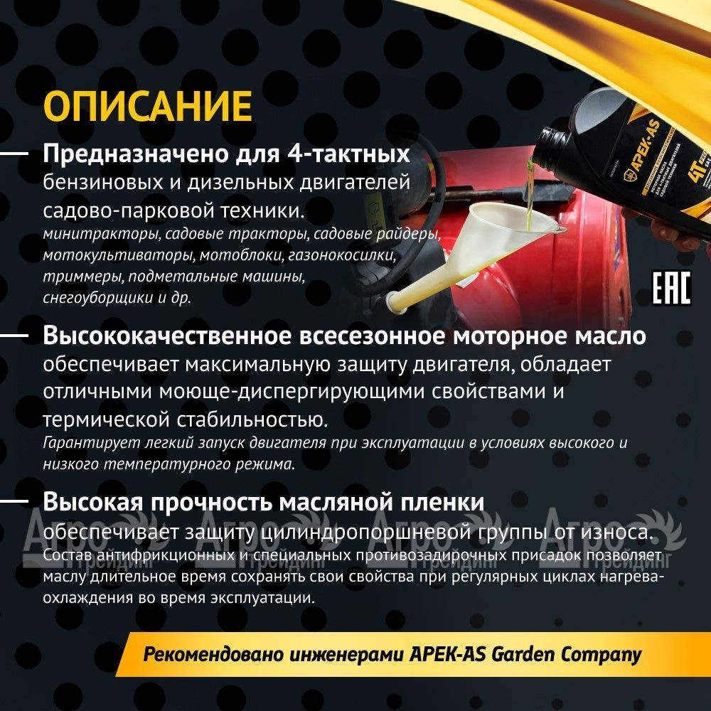 Характеристики товара: Масло моторное всесезонное полусинтетическое APEK-AS Premium 5W30 (1,0л.) для 4-х тактных двигателейПодробное описание товараВсесезонное полусинтетическое моторное масло APEK-AS серии Premium, вязкостью SAE 5W30 для 4-тактных бензиновых двигателей. Применяется для садовых тракторов, газонокосилок, мотоблоков, культиваторов, подметальных машин, сенокосилок, генераторов, снегоуборщиков и др. садово-парковой, коммунальной, строительной, силовой техники, а также техники малой механизации. Масло моторное APEK-AS премиум класса создано на синтетической основе, обладает высоким индексом вязкости и теплоустойчивостью, а также отвечает строгим техническим требованиям. Превосходные антиокислительные свойства позволяют значительно увеличить интервал его замены и существенно экономить расход топлива. Адгезионное сцепление с металлом на молекулярном уровне формирует надежную защитную пленку на поверхности всей шатунно-поршневой группы, защищая двигатель на малых и больших нагрузках. Активные моющие присадки, удерживающие загрязнения в объеме масла, предотвращают образование отложений, снижающих эффективность работы двигателя. Эксплуатационные свойства успешно прошли проверку на садово-парковой технике, применяемой в промышленных целях на высоких нагрузках, поэтому уверенность работы двигателя на моторном масле APEK-AS Premium максимальна. Легкий запуск при температуре –30°С +30°С. Удовлетворяет всем требованиям системы сертификации API - SG/CD для 4-тактных двигателей. Преимущества