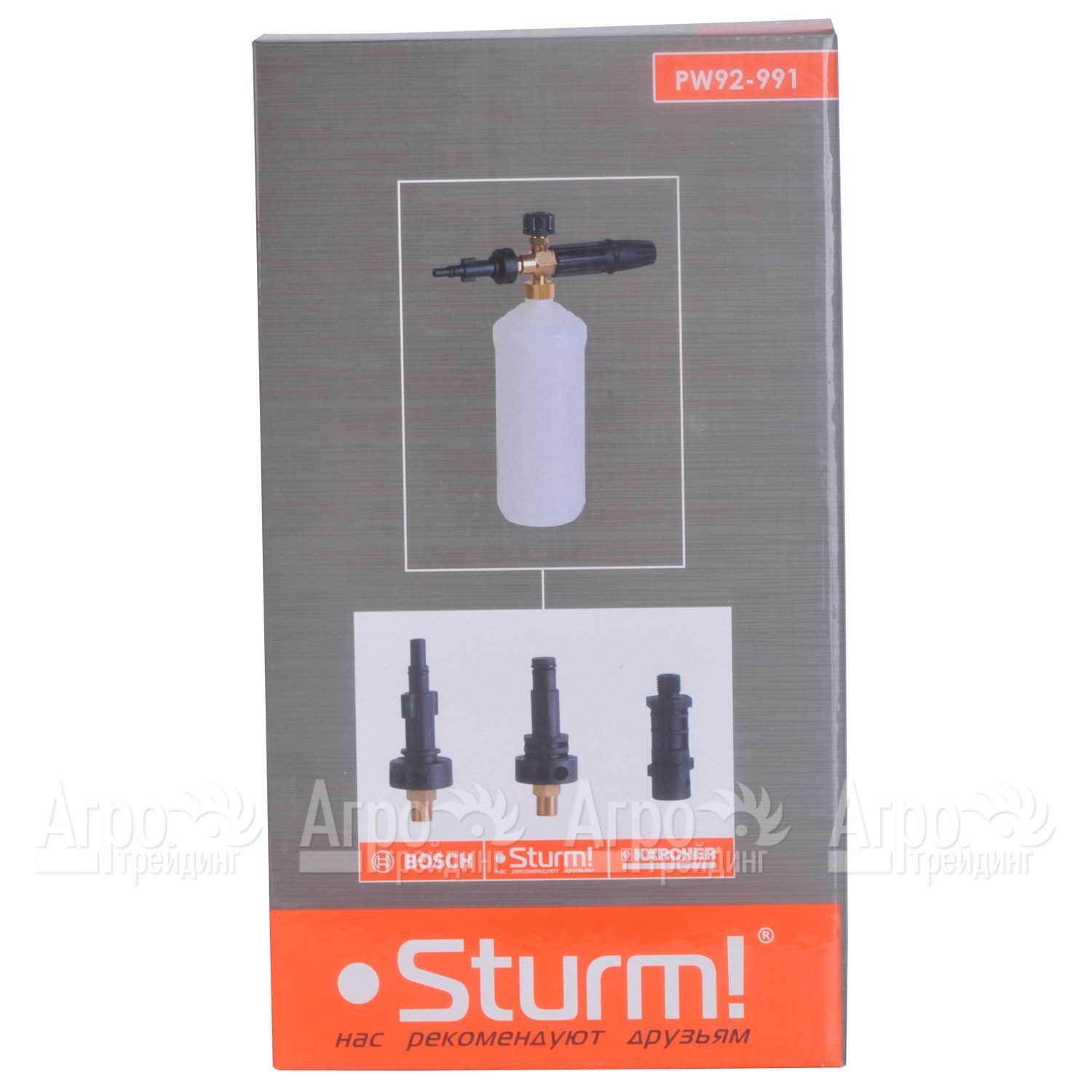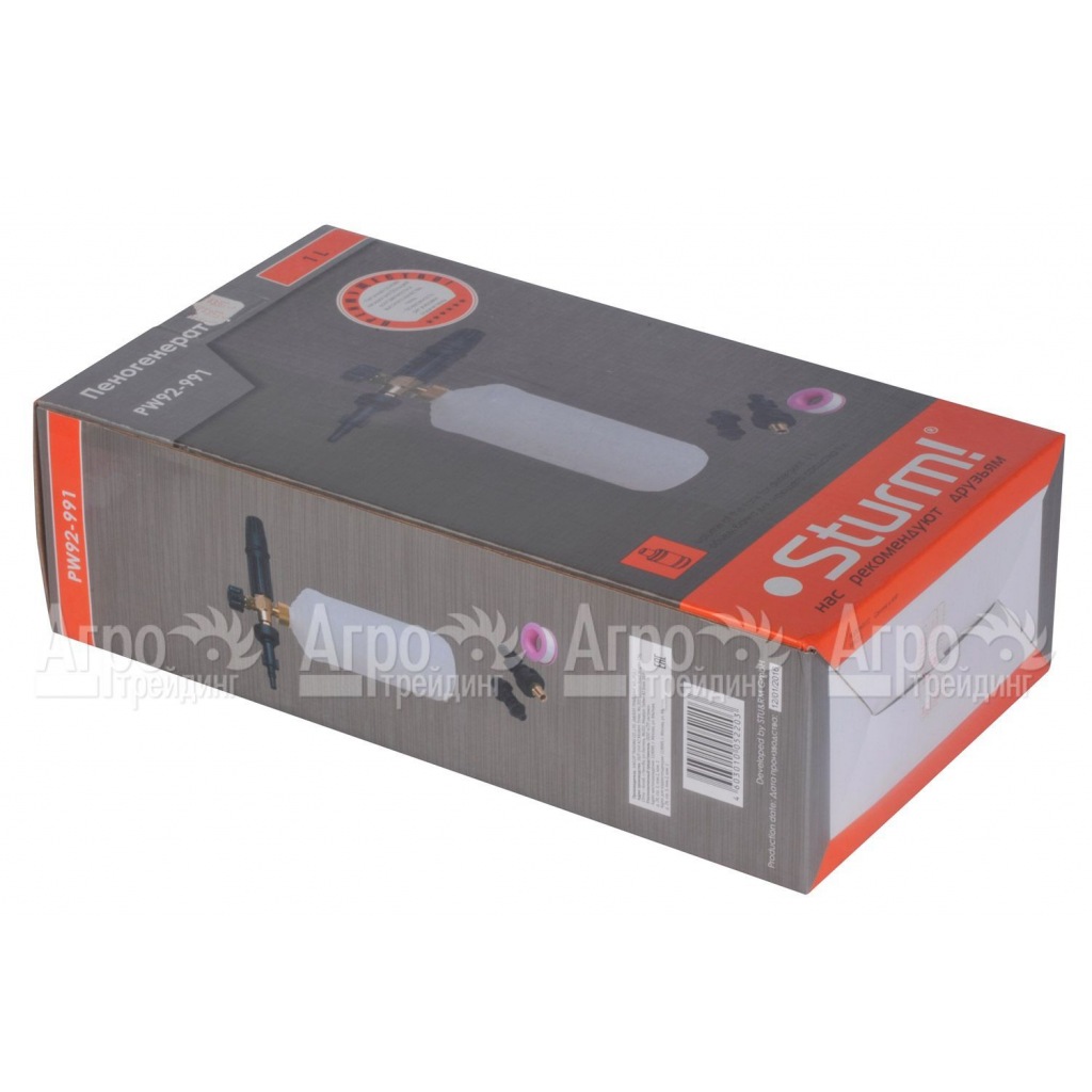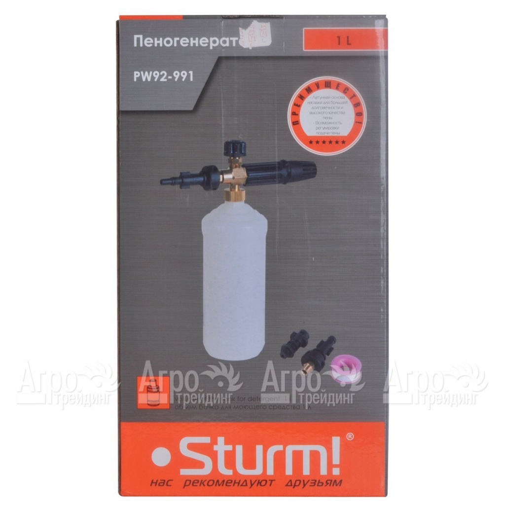 Характеристики товара: Пеногенератор Sturm PW92-991Подробное описание товараПеногенератор Sturm PW92-991 приобретают собственники автомобилей для самостоятельной очистки техники. Sturm PW92-991 имеет латунную основу, благодаря которой аппарат будет служить долгие годы. Также производитель Sturm предусмотрел специальную таблетку, обеспечивающую качественную и густую пену. На одной заправке пеногенератором Sturm PW92-991 можно очистить четыре автомобиля. Внутренняя часть бака защищена от деформаций, износов. В комплектации с парогенератором имеется тефлоновая лента (ФУМ) и три съемные насадки.