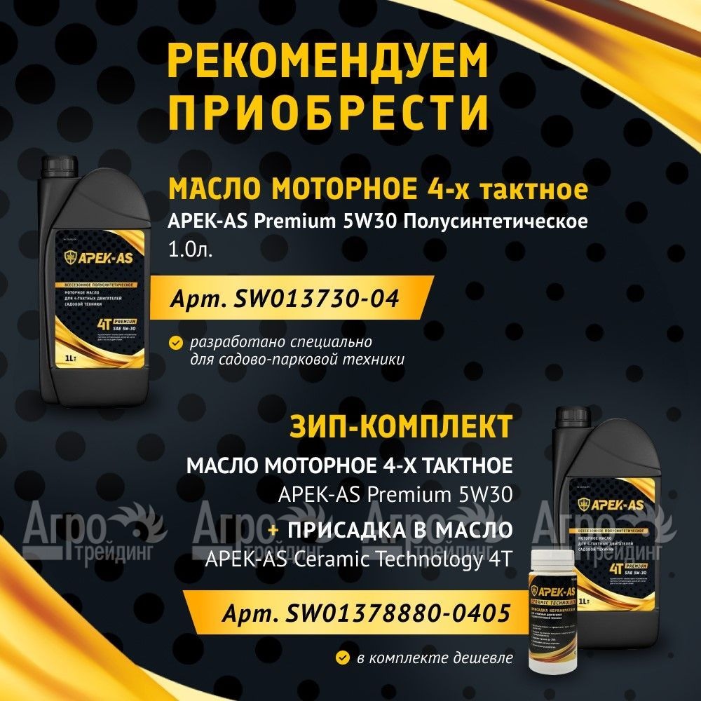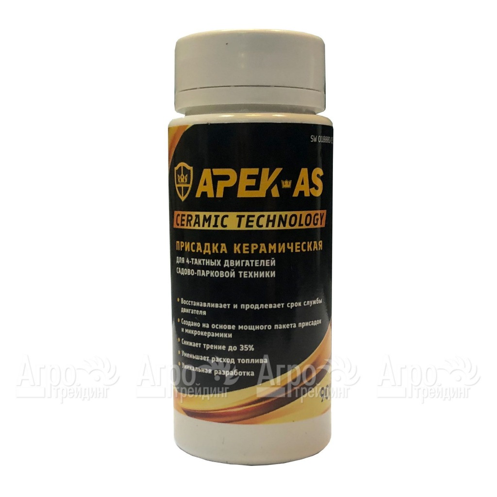 Характеристики товара: Присадка в масло керамическая APEK-AS Ceramic Technology 4Т для садово-парковой техникиПодробное описание товараУникальная керамическая присадка APEK-AS Ceramic Technology 4Т специально разработана для бензиновых и дизельных 4-х тактных двигателей садово-парковой техники. Применяется для ДВС садовых тракторов, бензиновых газонокосилок, мотокультиваторов, мотоблоков, подметальных машин, сенокосилок, снегоуборщиков и др. техники малой механизации. Устранит старение и продлит срок службы нового мотора. Комплекс присадок создают плотную и очень прочную масляную пленку, а микрочастицы керамики сглаживают неровности поверхностей трения и эффективно рассеивают тепло. Таким образом предотвращается непосредственный контакт металлических поверхностей и износ двигателя даже в самых экстремальных условиях (повышенная влажность, большие нагрузки, высокая и низкая температура окружающей среды и мн.др.). Добавление состава происходит напрямую в масляно-заливную горловину, как на уже залитое использованное моторное масло, так и в новое масло перед заменой (перед применением флакон необходимо встряхнуть). Может быть использовано с любыми вязкостями и марками моторных масел. Дозировка от 20 до 90 мл на 1 литр моторного масла. Преимущества