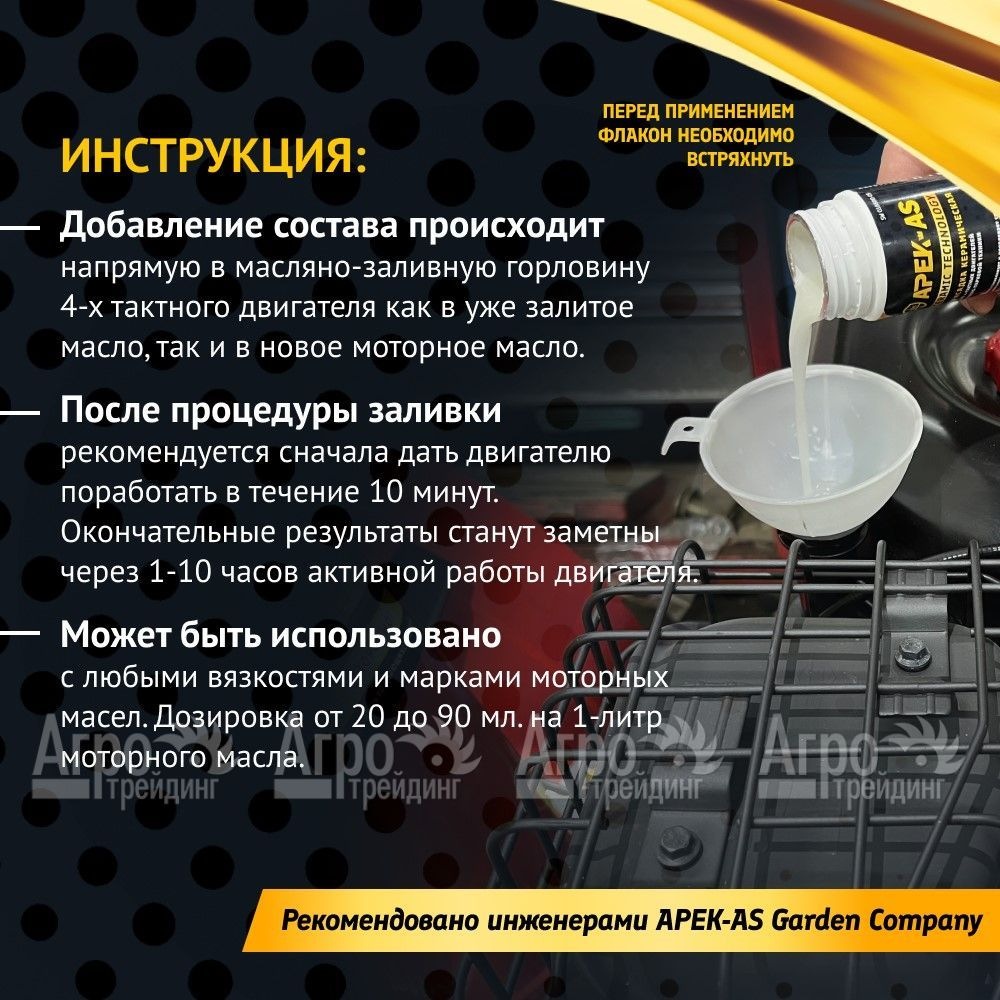 Рекомендовано APEK-AS Garden Company. На фотографии Присадка в масло керамическая APEK-AS Ceramic Technology 4Т для садово-парковой техники: