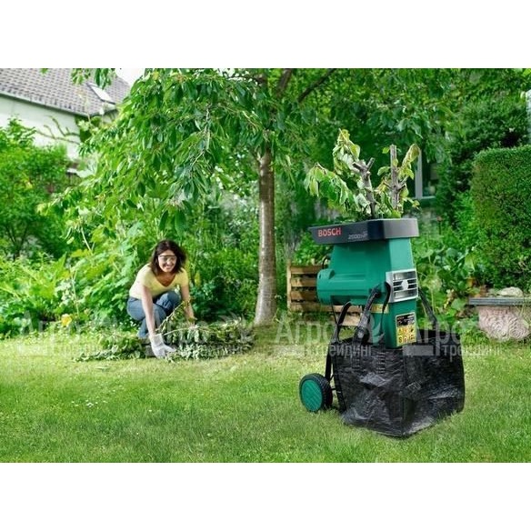Бесшумный измельчитель Bosch. Минимальный уровень шума. Имея крутящий момент до 652 Н/м, измельчает ветки толщиной до 40 мм. Пропускная способность до 150 кг/ч с функцией автоматического затягивания.