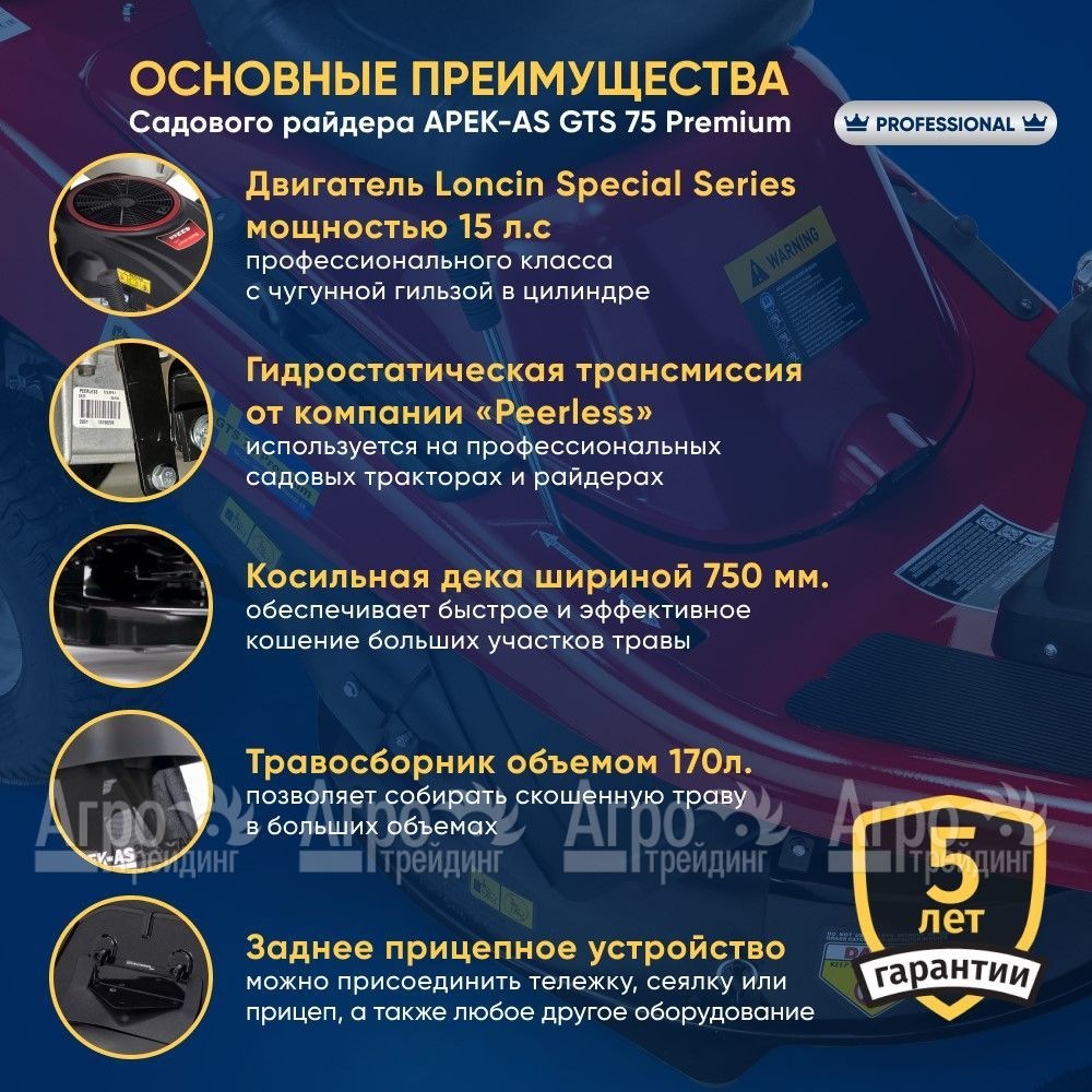 Характеристики товара: Садовый райдер APEK-AS GTS 75 PremiumПодробное описание товараСадовый райдер APEK-AS GTS 75 Premium - самый надежный и мощный райдер в России для кошения на малых, больших участках и склонах. Он превзошел все ожидания, т.к не имеет аналогов не только по качеству сборки, но и по мощности двигателя, ширине деки и другим техническим параметрам. Стоит отметить, что садовый райдер APEK-AS GTS 75 Premium оснащен лицензионным гильзованным двигателем Loncin, мощностью 15,0 л.с бренд которого используется на мотоциклах BMW, он обладает самой надежной в мире гидростатической трансмиссией «Peerless» (Husqvarna) пр-ва USA, имеет функцию кошения Reverse Mowing (скашивание задним ходом), усиленную подвеску, специальный протектор шин и вместительный травосборник, емкостью на 170 л. Широкая дека на 75 см позволяет райдеру регулировать высоту скашивания от 20 до 90 мм, что предоставляет владельцу большую гибкость и возможность точно настроить процесс скашивания под свои предпочтения. Также садовый райдер APEK-AS GTS 75 Premium имеет ряд других преимуществ, в сравнении с конкурентами, например, в отличие от райдеров других производителей, корпуса которых сделаны из пластика, способствующего к трещинам и выцветанию, то основной корпус райдера APEK-AS GTS 75 Premium выполнен из металла. Благодаря наличию бокового выброса травы, райдер позволяет удобно и быстро освобождать скошенную траву. Это значительно упрощает процесс уборки и обеспечивает более эффективную работу. Кроме того, он оснащен функцией мульчирования, которая превращает отработанную траву в органическое удобрение для газонов. Это не только способствует здоровому росту газона, но и сокращает количество отходов на вашей территории. Дополнительно райдер комплектуется задним прицепным устройством, за счет которого вы всегда можете присоединить тележку, прицеп и прочее дополнительное оборудование. APEK-AS GTS 75 Premium - это профессиональный садовый райдер, имеющий полный спектр возможностей и обеспечивающий высочайшую производительность. Он имеет официальную гарантию 5-лет, что подчеркивает его высокий уровень надежности и долговечности. Основные преимущества и оснащение модели: