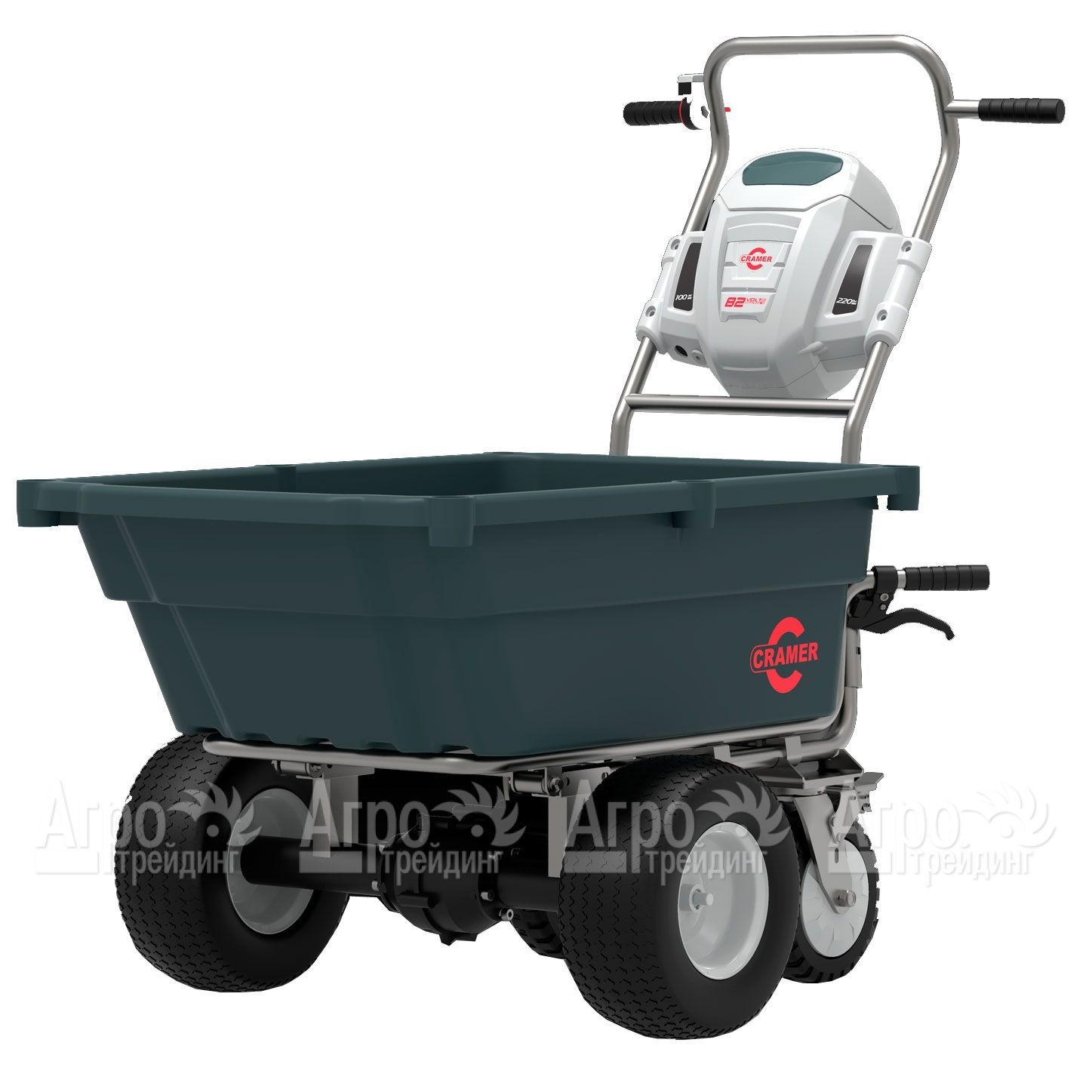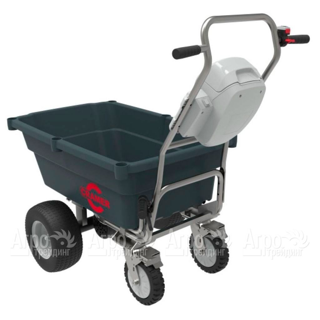 Характеристики товара: Самоходная тележка Cramer 82UCПодробное описание товараСамоходная тележка Cramer 82UC предназначена для использования в бытовых целях. Данный агрегат будет полезен на приусадебном участке, на даче и огороде, в фермерском хозяйстве. Его основное назначение, перевозка грунта, мусора, удобрений, тяжёлых предметов, урожая, собранного на территории личного подсобного хозяйства. К преимуществам данной модели относят опрокидывающееся корыто, управляемый с помощью специального рычага или вручную, надёжный аккумулятор, обеспечивающий длительную беспрерывную работу машины, электрический двигатель, большую грузоподъёмность и длительный срок службы. Грузовая самоходная тележка Cramer 82UC размещается на жёсткой прочной раме, имеет широкие устойчивые передние колёса и небольшие задние поворотные колёса, обеспечивающие лёгкость манёвра агрегата. Среди плюсов модели выделяют наличие двух передних и одной задней скорости, а также небольшой собственный вес тележки. Для безопасной работы на самоходном оборудовании установлен стояночный тормоз.